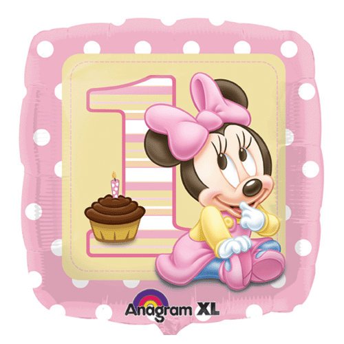 - Design: The square balloon has a light pink border with white polka dots all over. In the middle is a tan square with a pink stitched border. On the right side is a baby Minnie Mouse sitting down next to a pink striped number 1. On the left side of the 1 is a little cupcake with chocolate frosting and a pink polka dotted candle.