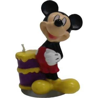 This molded candle of Mickey standing next to a frosted cake measures 3" h.