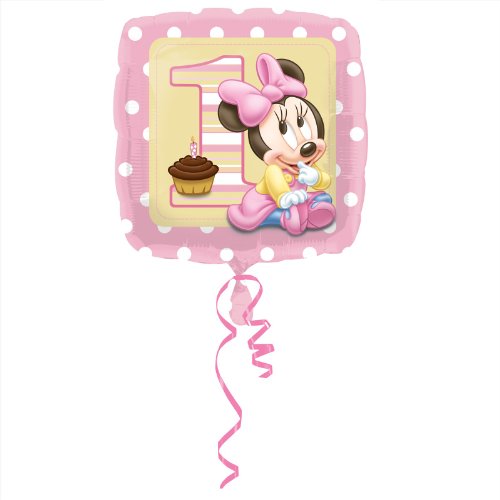• Design: The square balloon has a light pink border with white polka dots all over. In the middle is a tan square with a pink stitched border. On the right side is a baby Minnie Mouse sitting down next to a pink striped number 1. On the left side of the 1 is a little cupcake with chocolate frosting and a pink polka dotted candle.