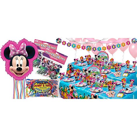 The Minnie Mouse Ultimate Party Kit includes: 16 Minnie Mouse Lunch Plates, 16 Minnie Mouse Lunch Napkins, 16 Minnie Mouse Paper Cups, 2 Minnie Mouse Plastic Tablecover 54 x 102, 16 Plastic Pink Forks, 16 Plastic Pink Spoons, 16 Plastic Pink Knives, 16 Minnie Mouse Invitations, 16 Minnie Mouse Blowouts, 1 Minnie Mouse Banner, 2 Minnie Mouse Centerpiece, 20 Pink Balloons, 1 Light Pink Curling Ribbon 66ft, 1 Pink Crepe Streamer 81ft, 1 White Crepe Streamer 81ft, 24 Birthday Candles, 2 Girl Fun Value Pack, 1 Mickey Pinata, 1 Pinata Bat, 1 Pinata Blindfold, 1 Pinata Filler