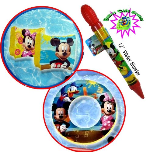 3-piece Disney Mickey Mouse Pool Set - Arm Floats, Swimming Ring, and a 12" Water Blaster - Use As a Mickey Mouse Gift Gift or Buy a Few for Mickey Mouse Clubhouse Party Favors - More Minnie Mouse and Mickey Mouse Party Supplies At Our Storefront - Link Below in "Product Features" Feature