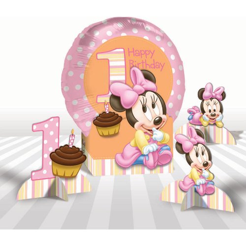 From the Disney Minnie Mouse Party Supply Collection. Disney Minnie Mouse 1st Birthday Balloon Centerpiece Set. Celebrate a first birthday with this adorable centerpiece set! Includes a foil Happy 1st Birthday balloon with a pink polka dot border and orange center on a cutout stand features baby Minnie Mouse. Also includes 3 smaller baby Minnie themed stand-up cutouts in pastel pink and yellow.